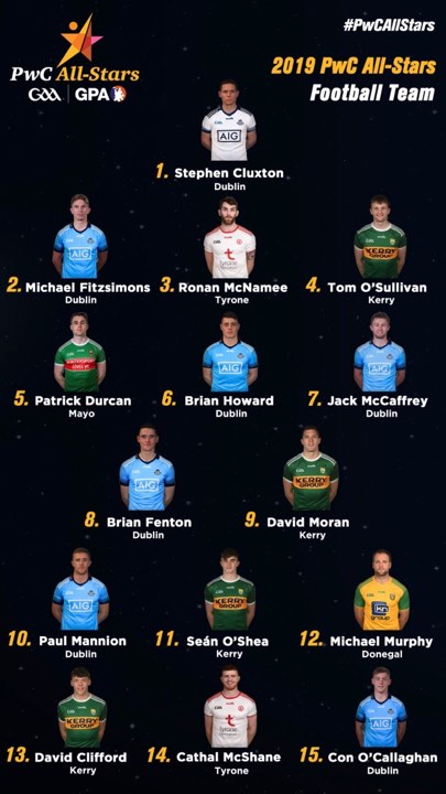 The 2019 PwC Football All-Star Team has been revealed, with All-Ireland champions Dublin dominating the team.